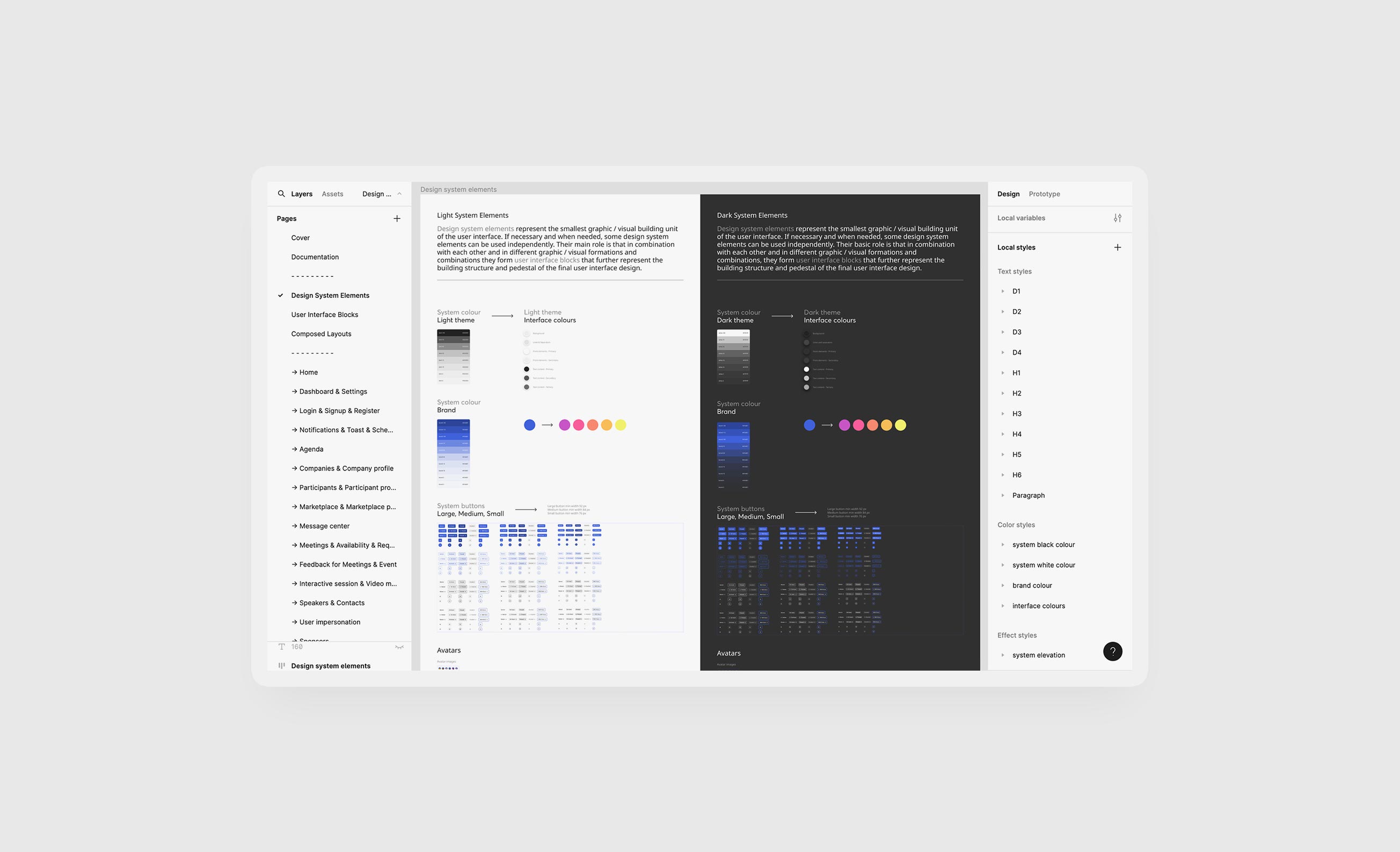 The creation of the design system was started with the vision that it would contain the complete anatomy of the product, that it would enable more efficient resolution of all future interruptions in interaction, and that it would enable the fundamental formation of new functionalities. Since the final number of components is measured in the hundreds, only a part will be shown mainly for the presentation of its structure: (1) design system elements as the smallest visible units of the interface (typography, colors, buttons, avatars, input fields, selectors, links, dropdown lists and the like), (2) user interface blocks where there are more complex interactive groups composed of elements of the design system (tabs, panels, navigation, modals, notifications) and (3) composed layouts where all interface pages are found in all their possible variations .