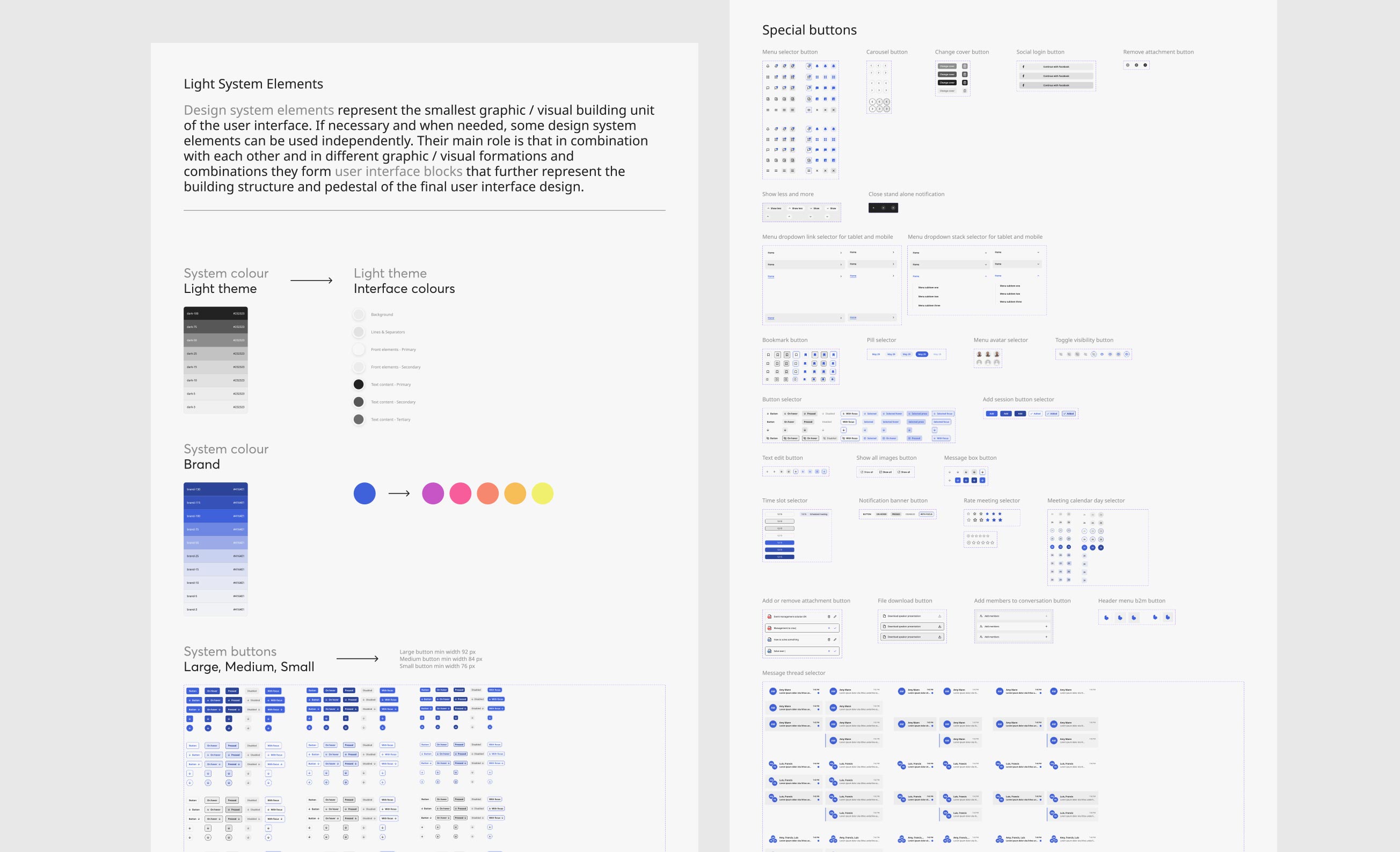 The creation of the design system was started with the vision that it would contain the complete anatomy of the product, that it would enable more efficient resolution of all future interruptions in interaction, and that it would enable the fundamental formation of new functionalities. Since the final number of components is measured in the hundreds, only a part will be shown mainly for the presentation of its structure: (1) design system elements as the smallest visible units of the interface (typography, colors, buttons, avatars, input fields, selectors, links, dropdown lists and the like), (2) user interface blocks where there are more complex interactive groups composed of elements of the design system (tabs, panels, navigation, modals, notifications) and (3) composed layouts where all interface pages are found in all their possible variations .