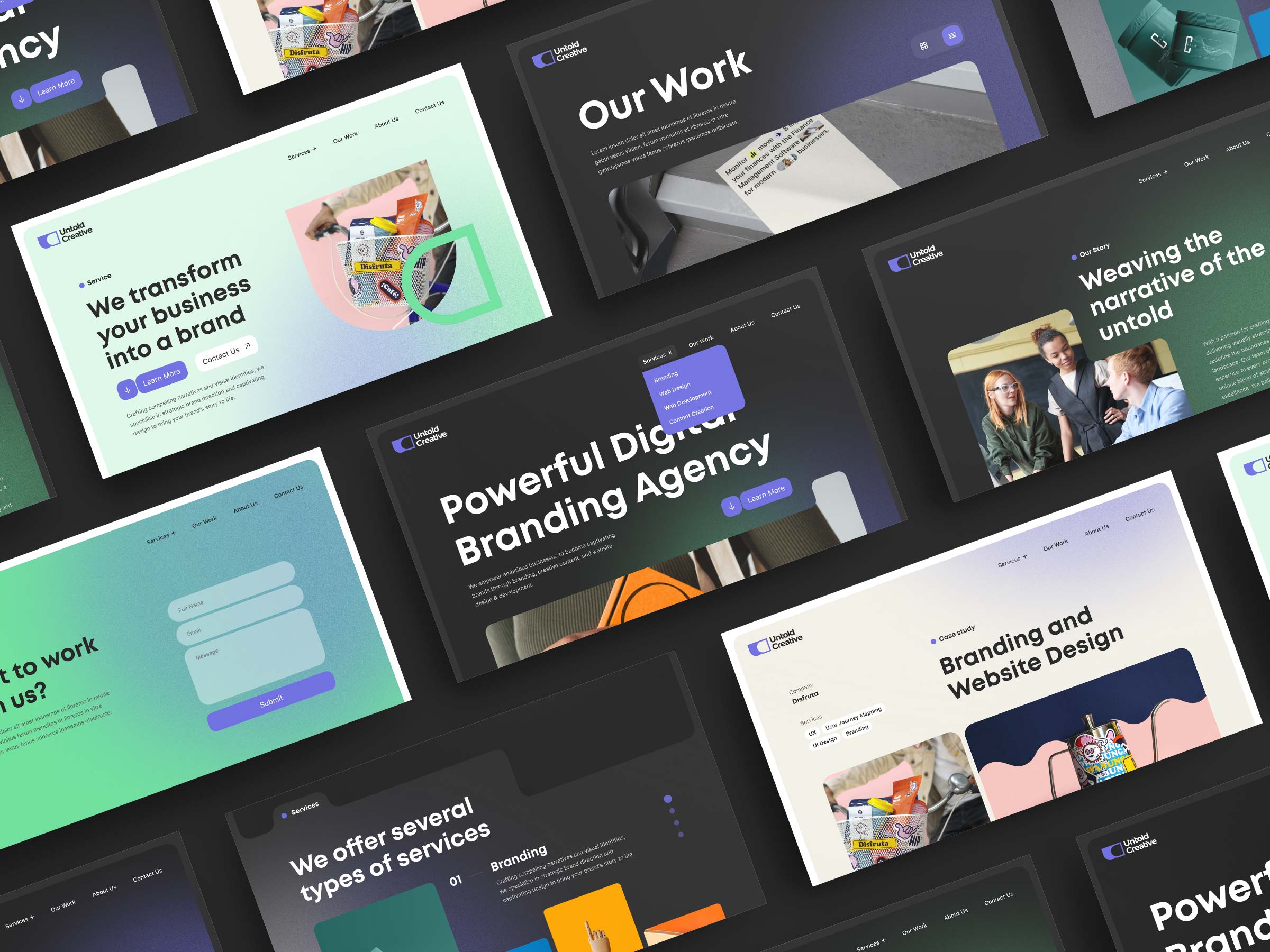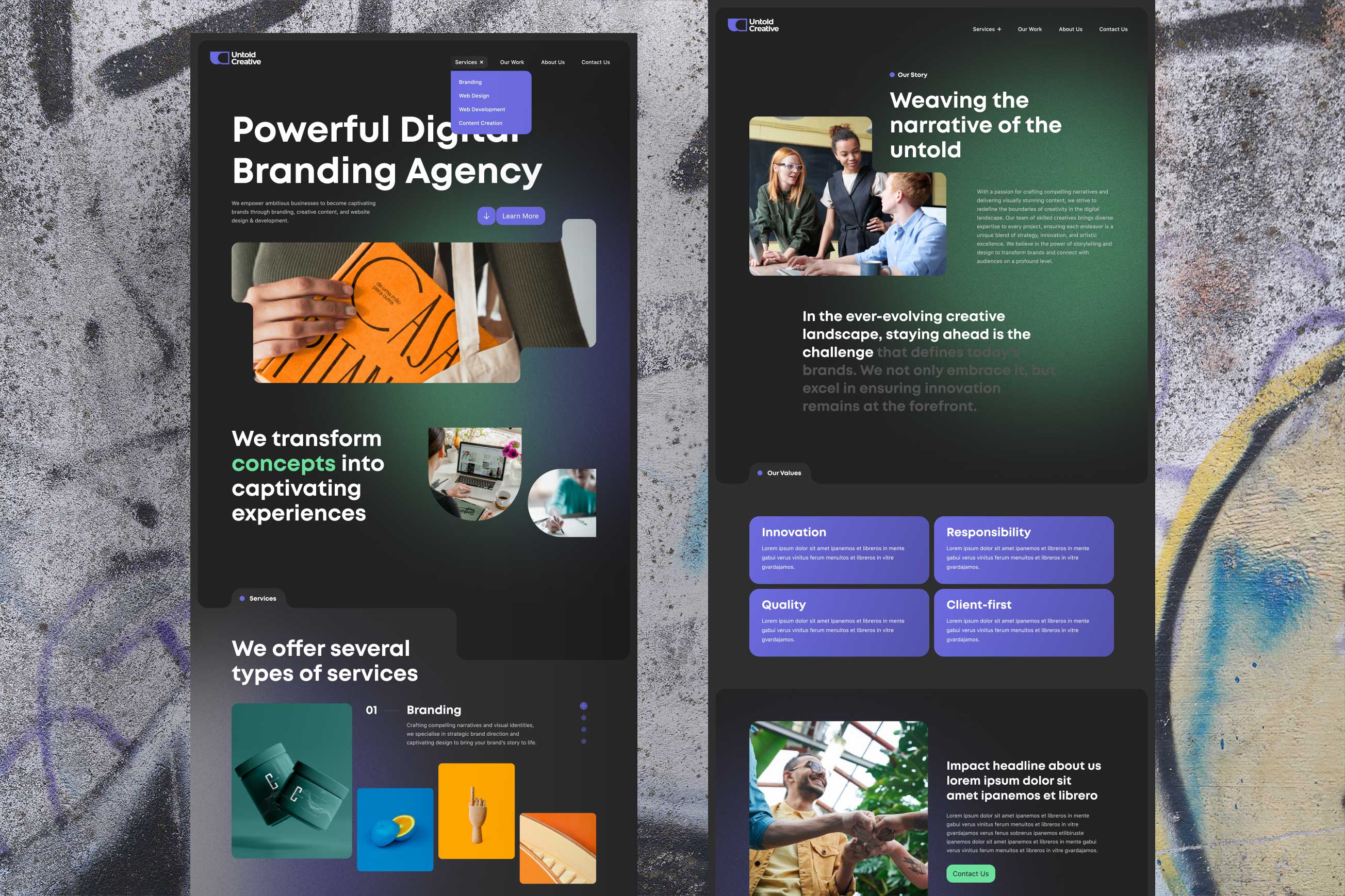 UntoldCreative is the name of a creative agency run by a team of creators from the fields of creative writing, marketing and design. The goal of the project was to design an identity and a responsive website. During the work on creating the identity, there were several different iterations and creative directions that ultimately resulted in the final solution of the logo symbol - a minimal geometric construction of the letters "U" and "C" which, repeated and rotated at appropriate angles, represent the initial letters of the name (UntoldCreative). The visual massiveness of the construction of the logo sign was transferred further to the graphic construction and design of the website. A mini design system for the website was created so that all elements and their defined interactions could be transferred and developed more easily.